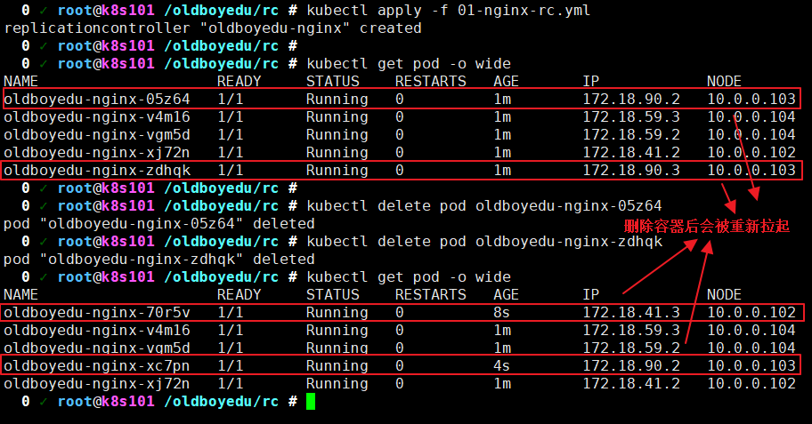 # 启动 kubectl apply -f 01-nginx-rc.yml # 删除Pod测试RC控制器是否会自动拉起新的Pod(删除效果如下图所示) kubectl delete pod oldboyedu-nginx-05z64 kubectl delete pod oldboyedu-nginx-zdhqk