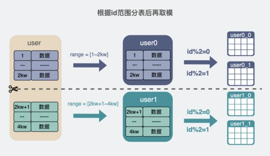 我们可以在某个id范围里,引入取模的功能。比如 以前 2kw~4kw 是user1表,现在可以在这个范围 再分成5个表 ,也就是引入user1-0, user1-2到user1-4,在这5个表里取模。