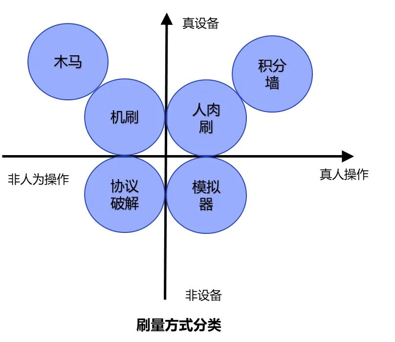 2.1 黑产刷量方式及优缺点黑产刷量方式大致可分为三类:模拟真人刷、接口刷、真人刷。