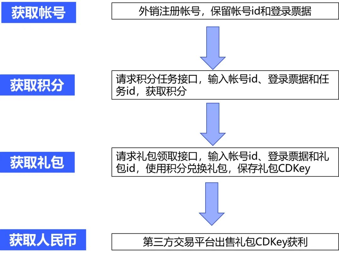 羊毛党通过批量注册帐号参与游戏厂商或者第三方平台的活动,领取礼包CDKey、充值礼券等,再通过交易平台出售给游戏玩家获利。