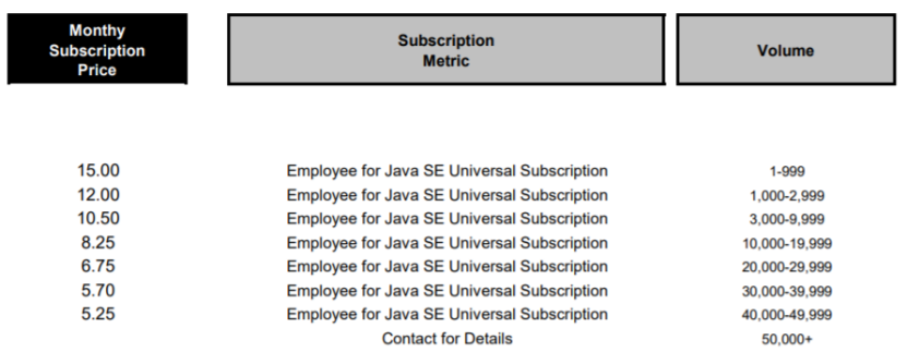 这也就表明,在这种全新的收费模式下,即使在一家企业中仅有一位开发者使用Java,Oracle也会按照企业员工的总数量进行收费。如果一家企业Java开发者的占比较大,且各类业务均依赖Java支持,那么新的收费标准并不会对这家企业造成多少影响;但如果企业开发人员占比较少,且对于Java的应用并不十分广泛,在新的收费模式下,企业则需要支付高出以往几倍甚至几十倍的订阅费用。