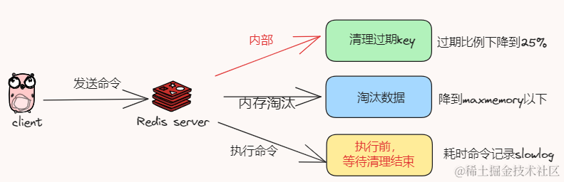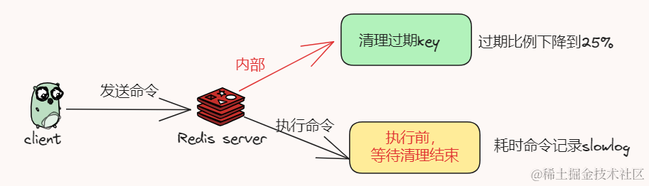 • 业务逻辑是否有定时任务的脚本程序,定期操作key• Redis的Key数量出现集中过期清理程序层面这个我们自己排查就好了,这里主要看下为什么Key数量集中过期,集中过期为啥造成了Redis访问变慢