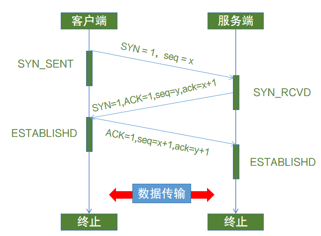 3)客户端收到道服务器端回应的SYN报文,回应一个ACK(ack=y+1)报文,发送完毕后,客户端进入ESTABLISHED状态,当服务器端接收到这个包时,也进入ESTABLISHED状态,开始数据传输。