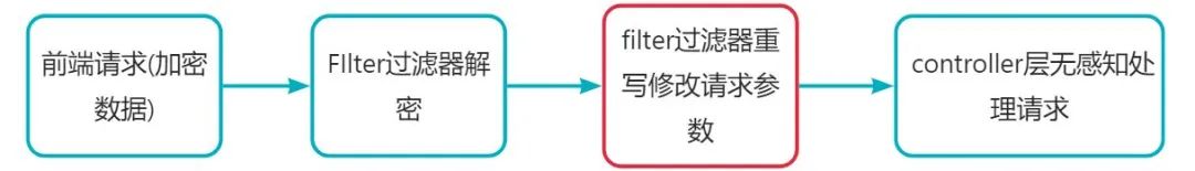 采用 FIlter 来对加密数据进行解密的好处之一是:Filter 获取到参数后,可以将密文参数解密之后,重新重写请求参数。这样在Controller层处理业务逻的接口可以按照正常方式进行开发,@RequestBody、@RequestParam 等注解都能正常使用。
