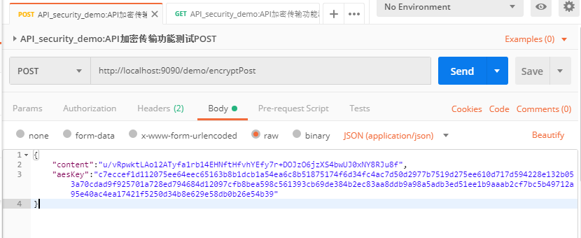 复制package com.example.api_security_demo.controller; import com.example.api_security_demo.common.R; import com.example.api_security_demo.common.core.annotation.ResponseEncrypt; import lombok.extern.slf4j.Slf4j; import org.springframework.web.bind.annotation.*; import javax.servlet.http.HttpServletRequest; /** * @ClassName : TbStudentController * @Description : 前端控制器Controller测试类 * @Author : AD */ @RestController @RequestMapping("/demo") @Slf4j public class TbStudentController { @PostMapping("/encryptPost") @ResponseEncrypt public R postDemo(@RequestBody TbStudentEntity tbStudentEntity,HttpServletRequest request){ System.out.println("request.getParameter(\"aesKey\") = " + request.getParameter("aesKey")); //System.out.println("request.getAttribute(\"aesKey\") = " + request.getAttribute("aesKey")); System.out.println("tbStudentEntity = " + tbStudentEntity); return R.ok(tbStudentEntity.toString()); } @GetMapping("/encryptGet") @ResponseEncrypt public R postDemoGet(HttpServletRequest request,@RequestParam String id,@RequestParam String name,@RequestParam String aesKey ){ System.out.println("id = " + id); System.out.println("name = " + name); System.out.println("aesKey = " + aesKey); System.out.println("request.getParameter(\"age\") = " + request.getParameter("age")); //System.out.println("request.getAttribute(DecryptReplaceStreamFilter.AKS_PARAMETER) = " + request.getAttribute(DecryptReplaceStreamFilter.AKS_PARAMETER)); return R.ok(); } }1.2.3.4.5.6.7.8.9.10.11.12.13.14.15.16.17.18.19.20.21.22.23.24.25.26.27.28.29.30.31.32.33.34.35.36.37.38.39.40.4.3 前端模拟生成加密数据