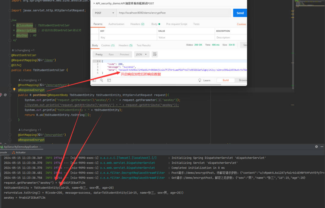 可以看出 请求数据解密后,通过 RequestWrapper重新封装后的请求数据,能直接通过@RequestBody 等注解直接获取到相请求体中的数据。同时也可以通过 request.getParameter()中存放的参数。