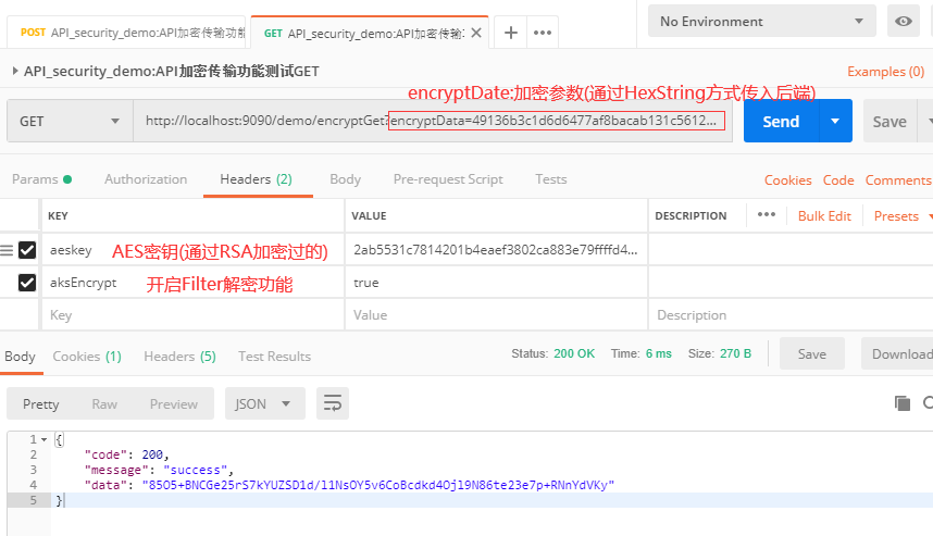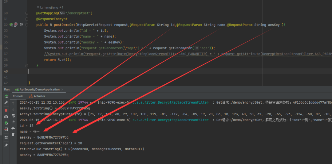 可以看出 请求数据解密后,通过 RequestWrapper重新封装后的请求数据,能直接通过@RequestParam等注解直接获取到Get请求中的数据。同时也可以通过 request.getParameter()中存放的参数。