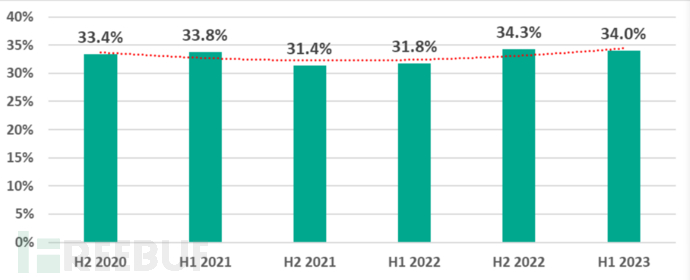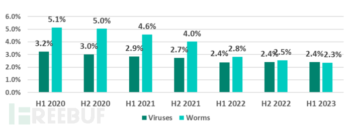 与2022年下半年相比,2023年上半年阻止病毒和蠕虫的ICS计算机百分比几乎没有变化。