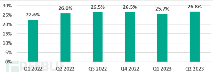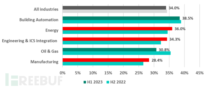 受攻击的ICS计算机百分比在2023年第一季度下降,但随后在2023年第二季度再次上升,工业告达到自2022年以来的自动最高季度数字——26.8%。