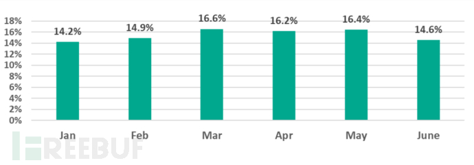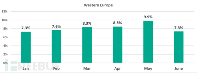 西欧是所有地区中增幅最大的地区,在2023年上半年,受到攻击的ICS计算机百分比逐月增长(直到5月份),云服务器提供商然后在6月份下降至1月份的水平。