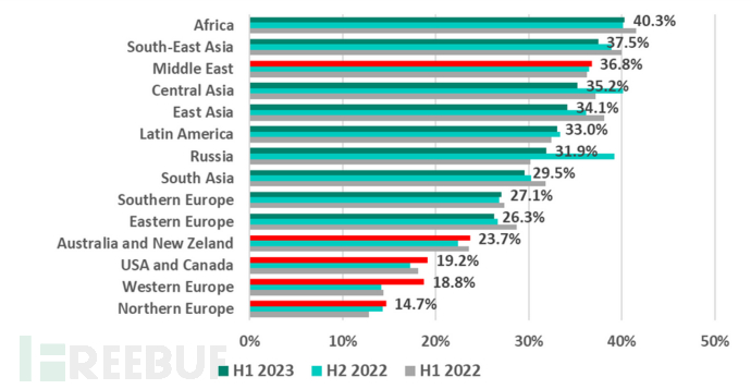 2023年上半年,在拦截间谍软件的ICS计算机中,比例最高的地区是非洲。中东和东南亚的比例也同样高。