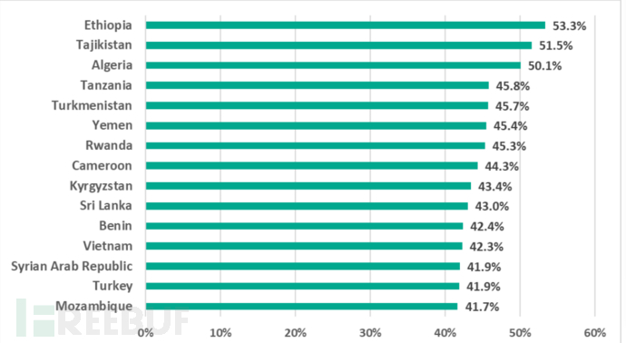 2023年上半年,在阻止恶意对象的ICS计算机比例最高的15个国家和地区中,有7个非洲国家、3个中东国家和3个中亚国家。