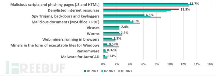 恶意脚本和网络钓鱼页面,占比7%;列入黑名单(Denylisted)的互联网资源,占比3%;间谍软件,占比6%;恶意文件,占比4%;勒索软件,占比32%。这是自2020年初以来的最低比例。