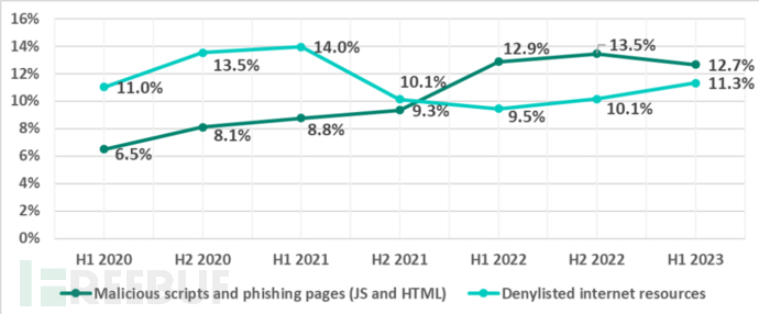 2022年之前,列入黑名单的互联网资源一直稳居威胁类别列表的榜首,但在2022年,它开始掉到第二名,仅次于恶意脚本和网络钓鱼页面,后者仍然位居榜首。然而,这两种威胁的价值正在趋同。