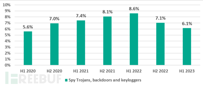 间谍软件阻止间谍软件的ICS计算机百分比继续下降。这种趋势的转折点出现在2022年上半年,在此之前(从2020年到2022年上半年)还始终呈现上升趋势。