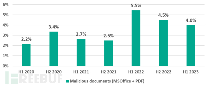 恶意文件(MSOffice +PDF)黑客通过网络钓鱼信息传播恶意文件,并利用它们进行攻击,目的是引起初次感染。在2022年上半年,全球阻止此类威胁的ICS计算机比例增加了一倍以上,此后便一直呈现下降趋势。然而,在2023年上半年,这一比例仍高于2020-2021年。