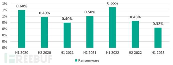 勒索软件拦截勒索软件的ICS计算机比例在2022年上半年有所增加,但在2023年上半年降至2020年以来的最低水平。