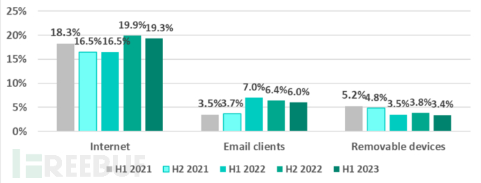 互联网占3%;电子邮件客户端占6%;可移动设备占4%。
