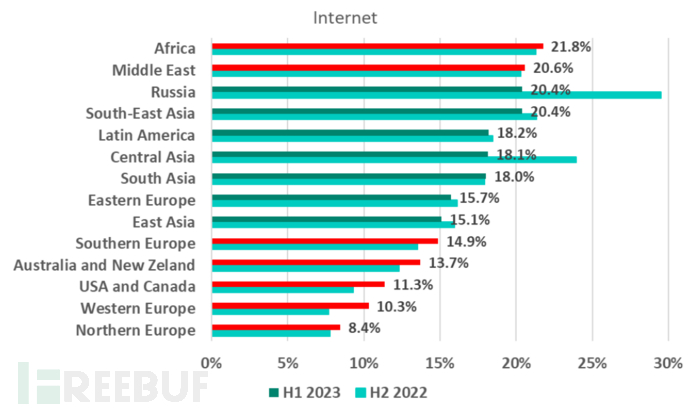 互联网威胁来源2023年上半年,阻止互联网威胁的ICS计算机比例最高的地区是非洲、中东和俄罗斯。