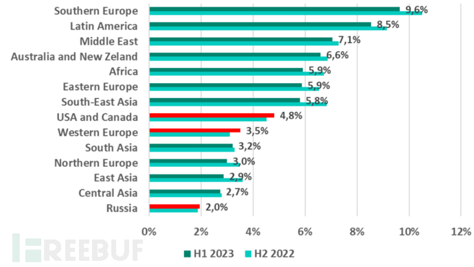 2023年上半年,在阻止互联网威胁的ICS计算机中,增幅最大的地区反而是那些被认为是“最安全的”地区:西欧(增长2.6个百分点)、美国和加拿大(增长2个百分点)、澳大利亚和新西兰(增长1.4个百分点)。