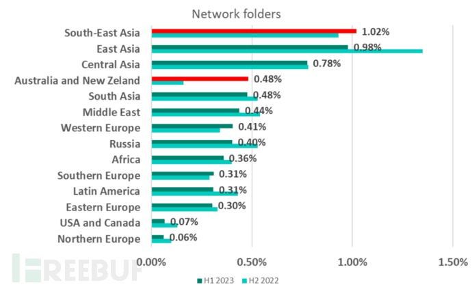 网络文件夹网络文件夹是恶意对象的一个次要来源。东亚、东南亚和中亚地区阻止网络文件夹威胁的ICS计算机比例最高。在澳大利亚和新西兰,这一数字在半年时间里翻了一番,使该地区排名第四。