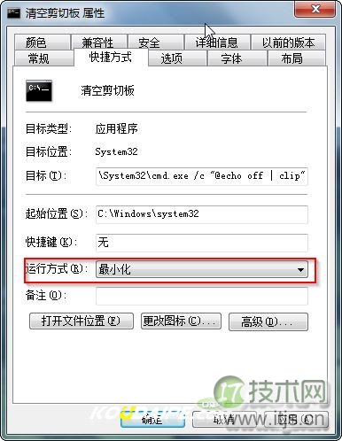 3、为了界面运行的美观性,可打开“清空剪切板”快捷方式的属性界面,将“运行方式”设置为“最小化”。(此步骤可要可不要) 如图3所示: