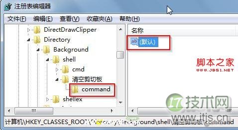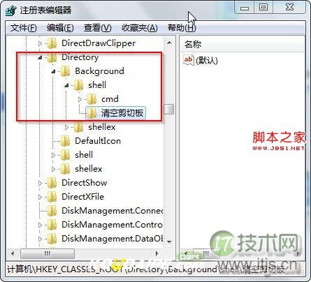 2、在注册表编辑器中,依次选择进入HKEY_CLASSES_ROOT→Directory→Backgroud→shell,右键点击shell文件夹,选择“新建”→“项”→命名为“清空剪切板”(注:此名称为右键菜单栏中的名称。)如图5所示: