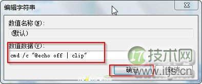4、在打开的编辑字符串界面中,输入cmd /c “@echo off | clip”,并点击确认。如图7所示: