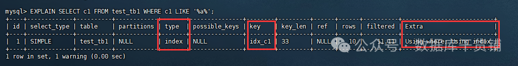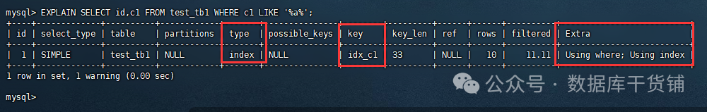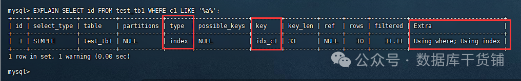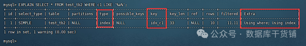 复制EXPLAIN SELECT id,c1 FROM test_tb1 WHERE c1 LIKE %a%;1.