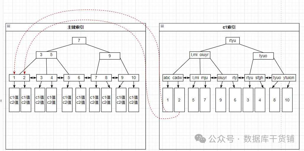如果例1中使用c1索引,则过程是,先在c1索引上进行整个索引的扫描,然后找到主键字段,因为找到的内容还缺少c2的值,因此需要再回到主键索引上进行检索,拿到所有字段的内容,这个代价相对较高