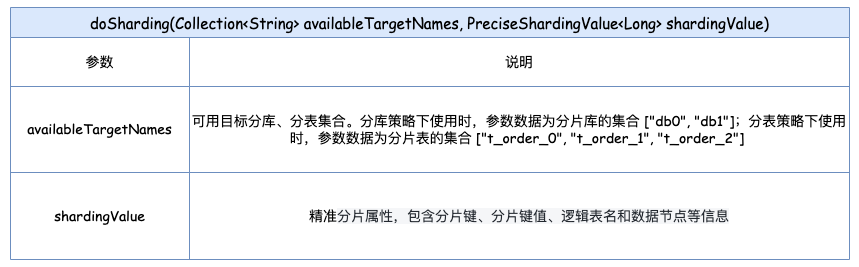 重写方法 doSharding(Collection availableTargetNames, PreciseShardingValue preciseShardingValue),该方法返回单一的分片数据源或分片表数据。有两个参数:一个是可用目标分库、分表的集合,另一个是精准分片属性对象。