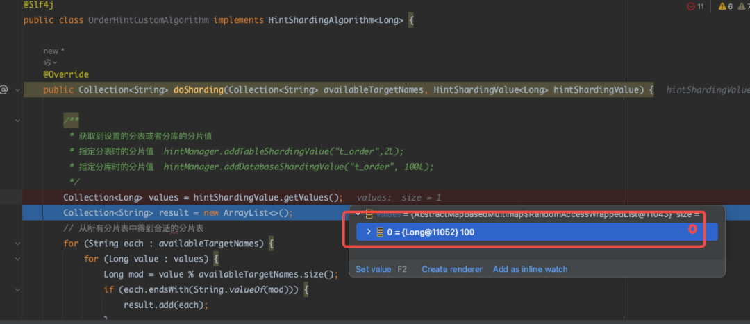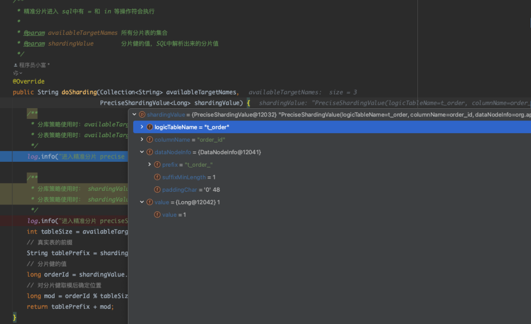 在插入测试数据时,默认会自动进入精确分片的 doSharding() 方法内,看到该方法会获取分片键的数值,根据我们的计算规则确定返回一个目标分片表用于路由。