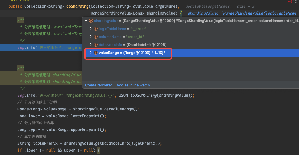 接着执行一个范围查询的 SQL,此时将进入范围分片的 doSharding() 方法。通过观察 shardingValue.getValueRange() 方法中分片键的数值范围,可以发现这些数值范围是从SQL查询中解析得到的。