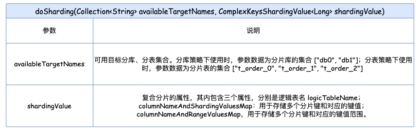 重写复合分片方法 doSharding(Collection availableTargetNames, ComplexKeysShardingValue shardingValues) 实现定制的多分片健逻辑,该方法有两个参数:一个是可用目标分库、分表的集合;另一个是多分片健属性对象。