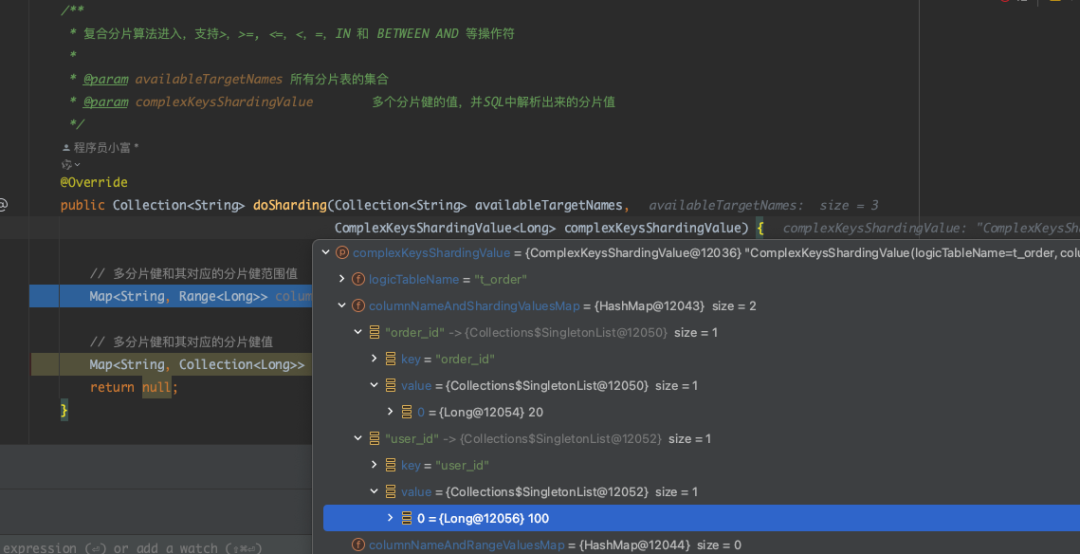 复制/** * 自定义复合分片算法 * * @author 公众号:程序员小富 * @date 2024/03/22 11:02 */ @Slf4j public class OrderComplexCustomAlgorithm implements ComplexKeysShardingAlgorithm<Long> { /** * 复合分片算法进入,支持>,>=, <=,<,=,IN 和 BETWEEN AND 等操作符 * * @param availableTargetNames 所有分片表的集合 * @param complexKeysShardingValue 多个分片健的值,并SQL中解析出来的分片值 */ @Override public Collection<String> doSharding(Collection<String> availableTargetNames, ComplexKeysShardingValue<Long> complexKeysShardingValue) { /** * 分库策略使用时:availableTargetNames 参数数据为分片库的集合 ["db0","db1"] * 分表策略使用时:availableTargetNames 参数数据为分片库的集合 ["t_order_0","t_order_1","t_order_2"] */ log.info("进入复合分片:complex availableTargetNames:{}", JSON.toJSONString(availableTargetNames)); // 多分片健和其对应的分片健范围值 Map<String, Range<Long>> columnNameAndRangeValuesMap = complexKeysShardingValue.getColumnNameAndRangeValuesMap(); log.info("进入复合分片:columnNameAndRangeValuesMap:{}", JSON.toJSONString(columnNameAndRangeValuesMap)); columnNameAndRangeValuesMap.forEach((columnName, range) -> { // 分片健 log.info("进入复合分片:columnName:{}", columnName); // 分片健范围值 log.info("进入复合分片:range:{}", JSON.toJSONString(range));}); // 多分片健和其对应的分片健值 Map<String, Collection<Long>> columnNameAndShardingValuesMap = complexKeysShardingValue.getColumnNameAndShardingValuesMap(); log.info("进入复合分片:columnNameAndShardingValuesMap:{}", JSON.toJSONString(columnNameAndShardingValuesMap)); columnNameAndShardingValuesMap.forEach((columnName, shardingValues) -> { // 分片健 log.info("进入复合分片:columnName:{}", columnName); // 分片健值 log.info("进入复合分片:shardingValues:{}", JSON.toJSONString(shardingValues));}); return null; } }1.2.3.4.5.6.7.8.9.10.11.12.13.14.15.16.17.18.19.20.21.22.23.24.25.26.27.28.29.30.31.32.33.34.35.36.37.38.39.40.41.42.43.44.45.46.47.48.49.配置算法