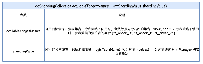 重写 HINT 核心分片方法 doSharding(Collection availableTargetNames, HintShardingValue shardingValue),以实现我们的定制逻辑。该方法接受两个参数:一个是可用目标分库、分表的集合,另一个是 Hint 分片属性对象。