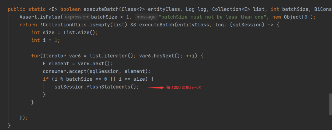 从上述源码可以看出,MP 是将要执行的数据分成 N 份,每份 1000 条,每满 1000 条就会执行一次批量插入,所以它的性能要比循环单次插入的性能高很多。
