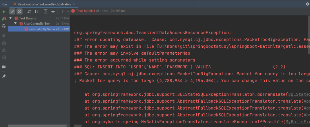 当我们将 MySQL 的最大执行 SQL 设置为 10M 之后,运行以上单元测试代码,执行的结果如下: