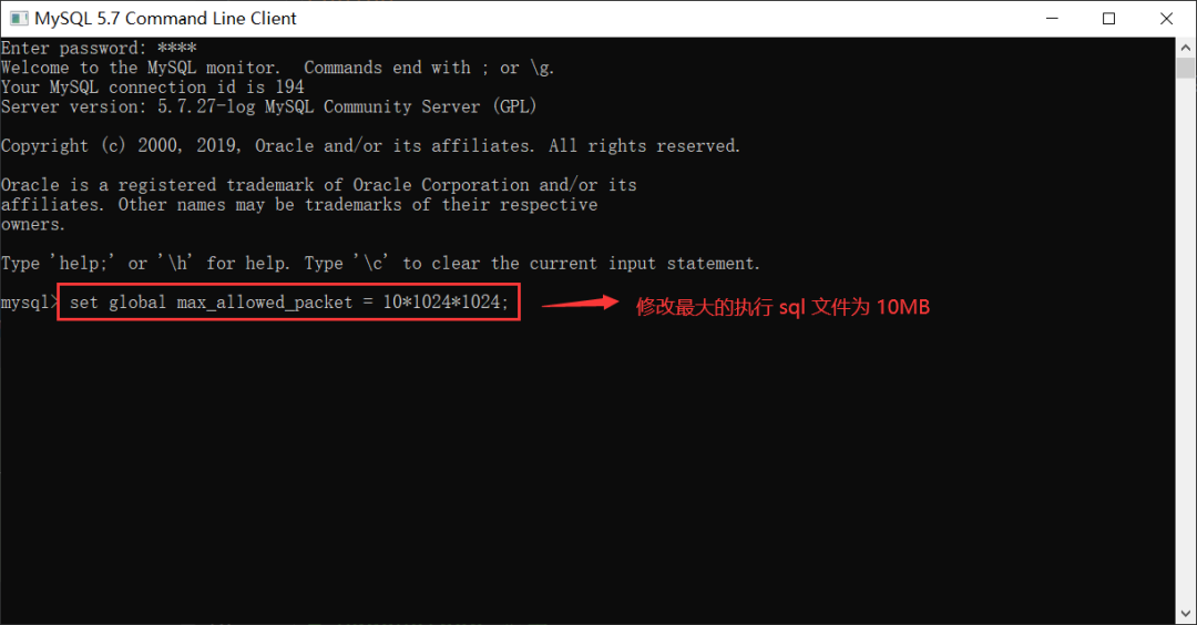 复制-- 设置最大执行 SQL 为 10Mset global max_allowed_packet=10*1024*1024;1.2.如下图所示: