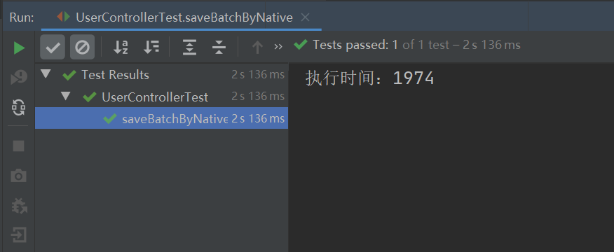 复制<?xml version="1.0" encoding="UTF-8"?><!DOCTYPE mapper PUBLIC "-//mybatis.org//DTD Mapper 3.0//EN" "http://mybatis.org/dtd/mybatis-3-mapper.dtd"><mapper namespace="com.example.demo.mapper.UserMapper"> <insert id="saveBatchByNative"> INSERT INTO `USER`(`NAME`,`PASSWORD`) VALUES <foreach collection="list" separator="," item="item"> (#{item.name},#{item.password}) </foreach> </insert></mapper>1.2.3.4.5.6.7.8.9.10.11.经过以上步骤,我们原生的批量插入功能就实现的差不多了,接下来我们使用单元测试来查看一下此方法的执行效率。