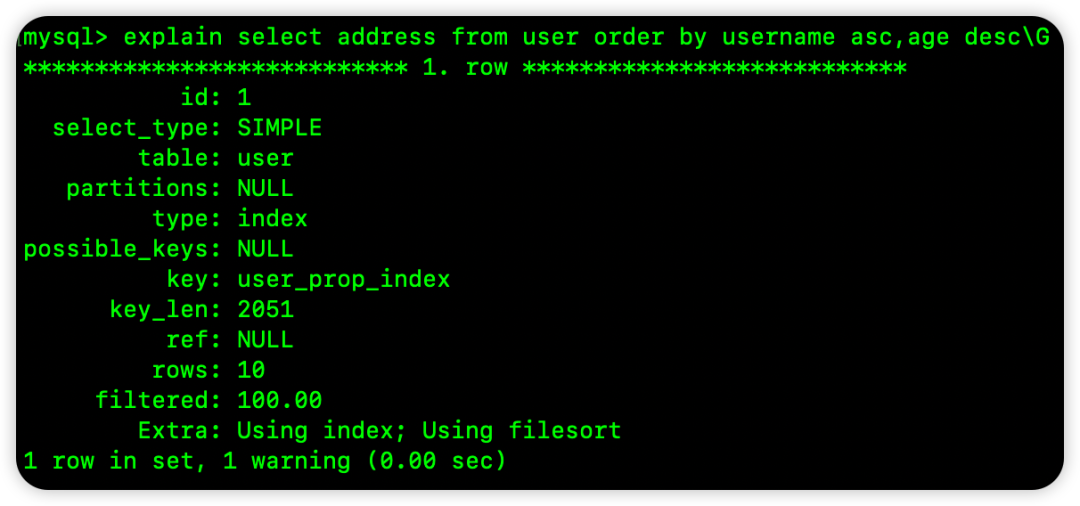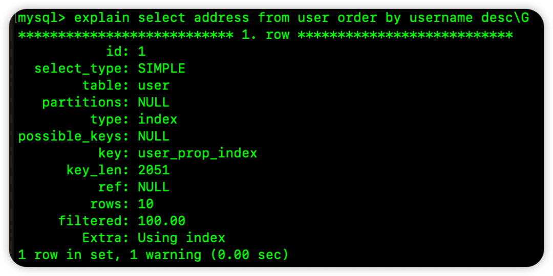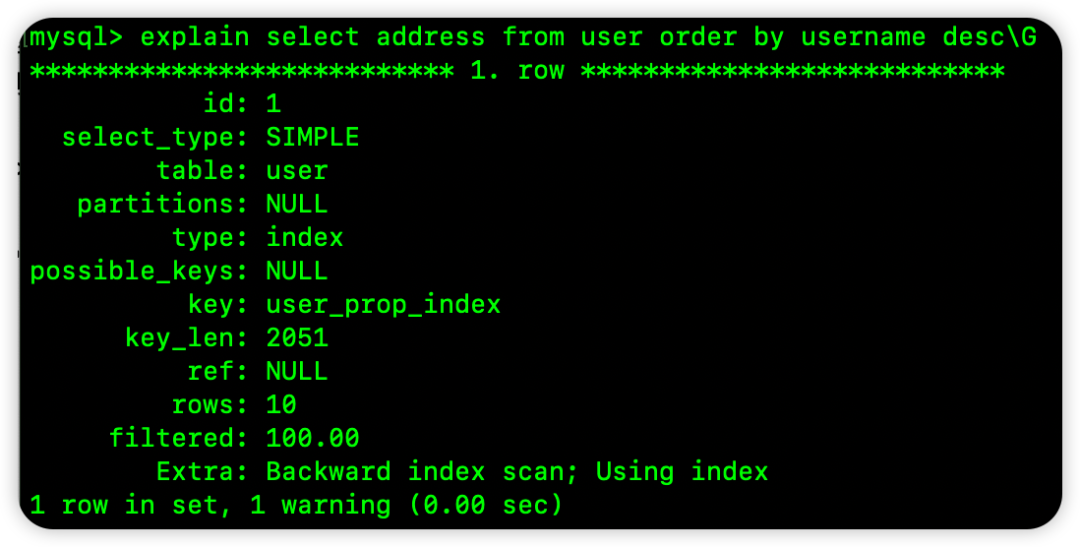 复制select address from user order by username desc1.这个 SQL 和 2.1 小节的 SQL 相比就是排序的顺序变了,第一个 SQL 没有写顺序,默认就是升序,这个里边写了是按照倒序来排列。B+Tree 中的 username 是升序,那么这个能用到索引排序吗?这个是可以使用到索引排序的,在 MySQL5.7 中,执行计划如下: