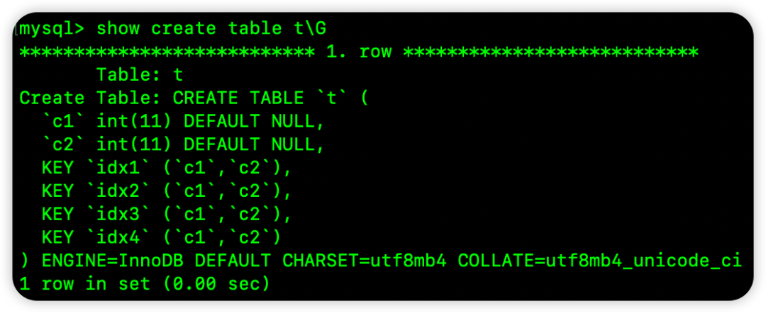 复制CREATE TABLE t ( c1 INT, c2 INT, INDEX idx1 (c1 ASC, c2 ASC), INDEX idx2 (c1 ASC, c2 DESC), INDEX idx3 (c1 DESC, c2 ASC), INDEX idx4 (c1 DESC, c2 DESC) );1.2.3.4.5.6.7.当我在 MySQL5.7 中执行如上 SQL 之后,再来查看表的定义,结果如下: