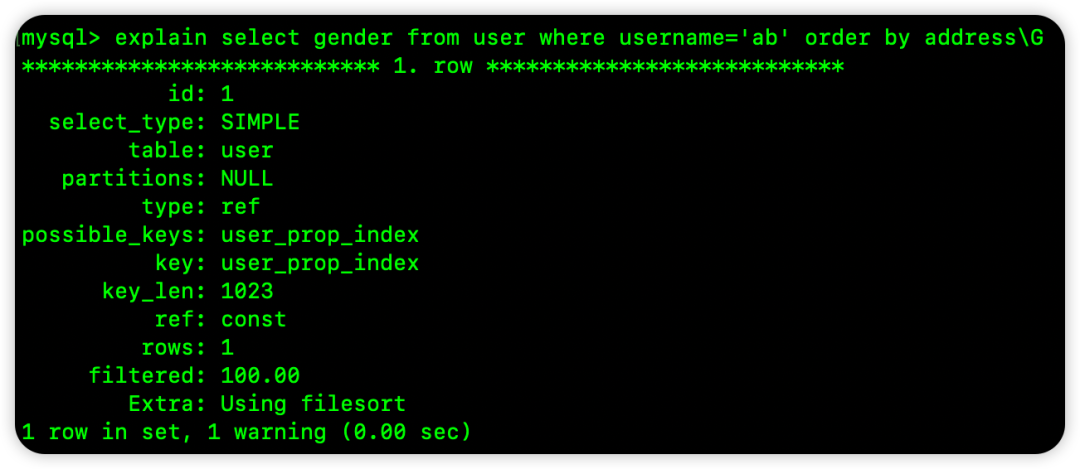 复制select gender from user where username=ab order by address1.这个 SQL 中 username 也是给指定了具体的值了,但是排序却是按照 address 排序的,小伙伴们知道,当 username 确定后,首先是按照 age 排序,其次才是按照 address 排序,所以,对于上面这个 SQL,从索引树中读取出来的数据,顺序并不一定是按照 address 排的,所以上面这个 SQL 无法用到索引排序: