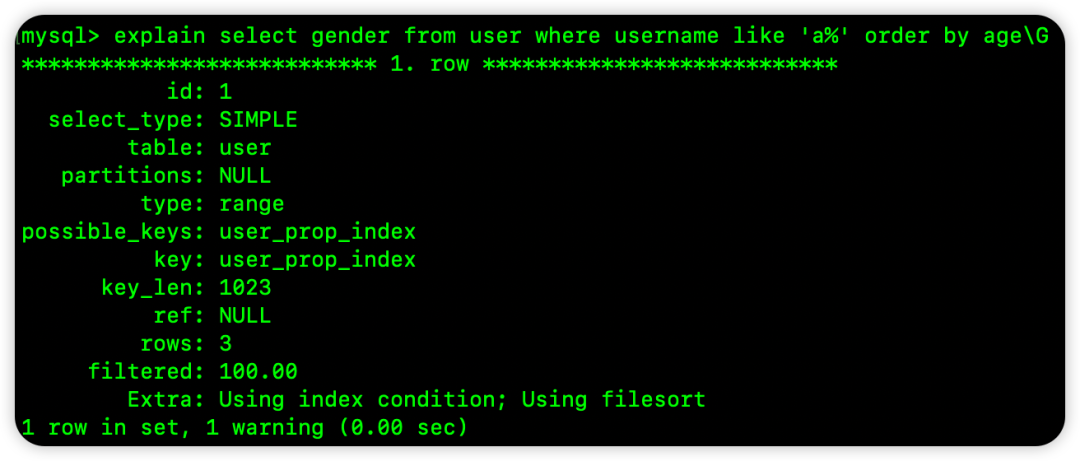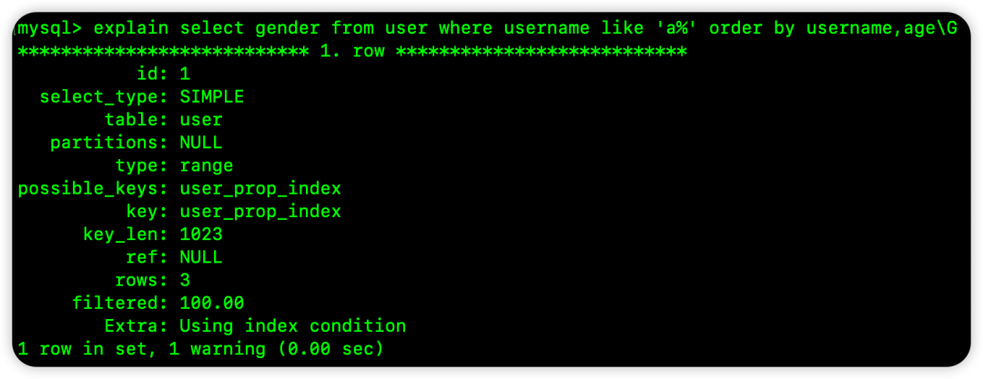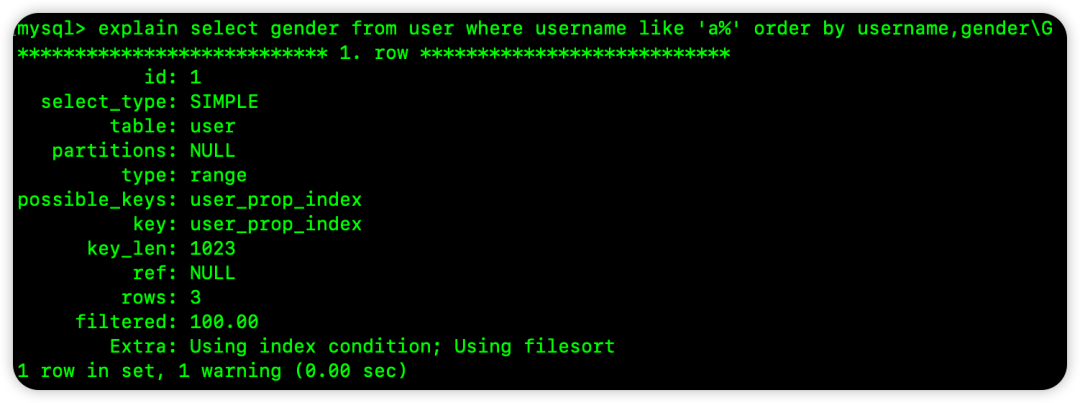 复制select gender from user where username like a% order by username,age1.这个虽然 username 也是按照范围搜索,但是最终排序的时候却是按照 username 和 age 排序的,按照范围搜索拿出来的 username 和 age 本身就是有序的,所以这里也可以使用索引排序: