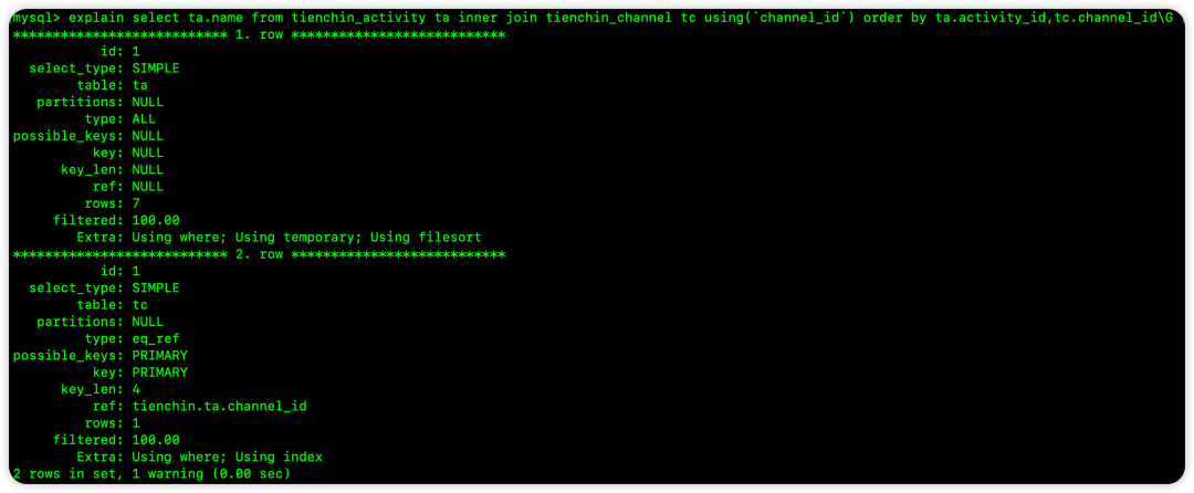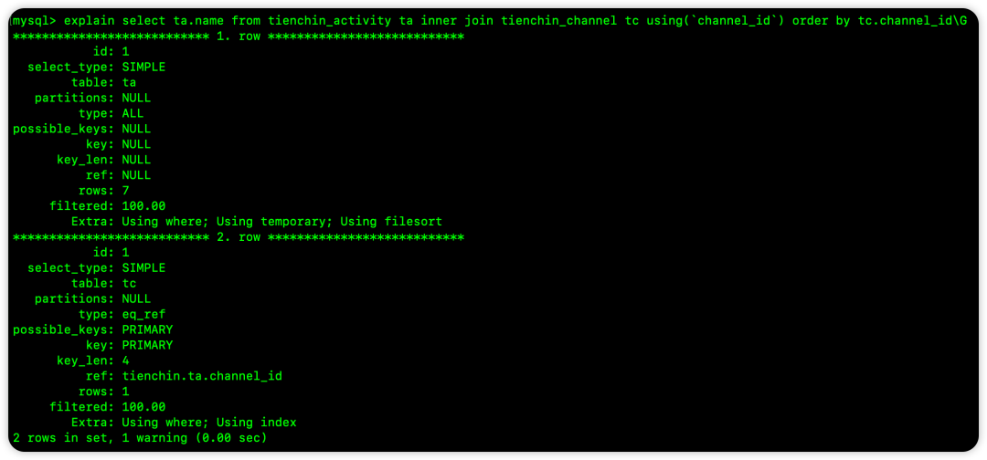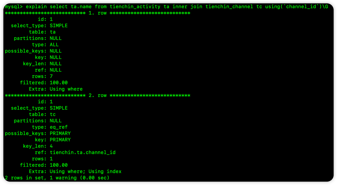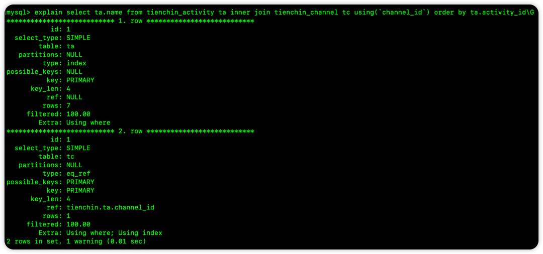 复制select ta.name from tienchin_activity ta inner join tienchin_channel tc using(`channel_id`)1.我们来看下这个 SQL 的执行计划: