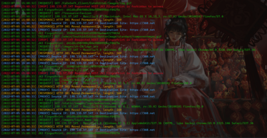 3 识别网络空间测绘扫描在测试的过程中,指纹库添加GO语言请求库的JA3指纹后,监测RedGuard请求流量情况。可以看到,大部分的请求触发了JA3指纹库特征的基础拦截。