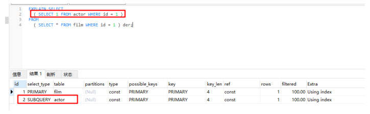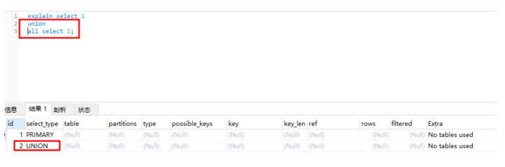 当有 union 时,UNION RESULT 的 table 列的值为,1和2表示参与 union 的 select 行id。