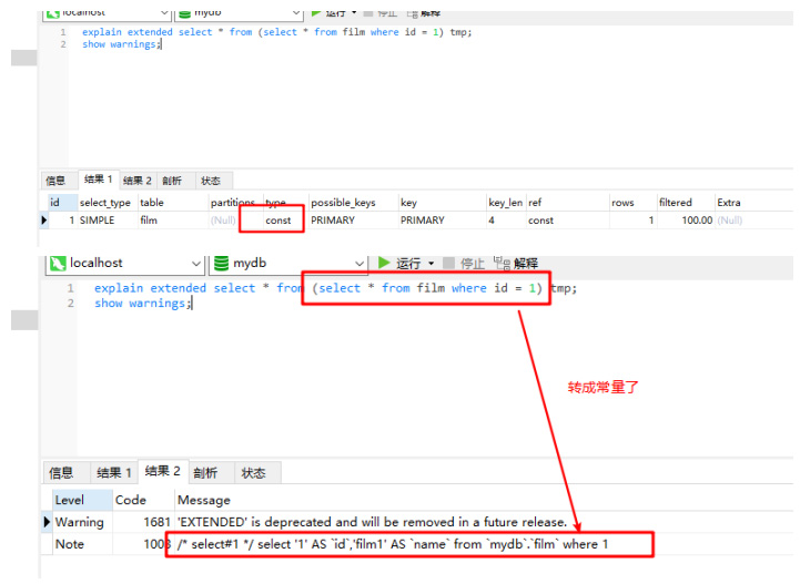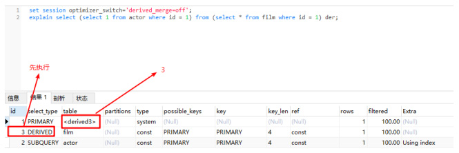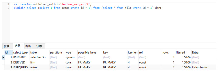 set session optimizer_switch=derived_merge=off;explain select (select 1 from actor where id = 1) from (select * from film where id = 1) der;1.2.3.