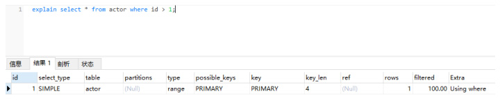 复制explain select * from actor where id > 1;1.