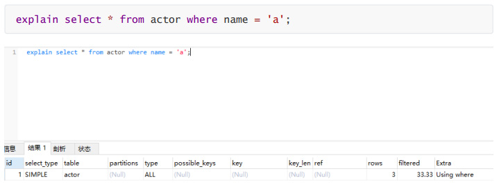 复制explain select * from actor where name = a;1.